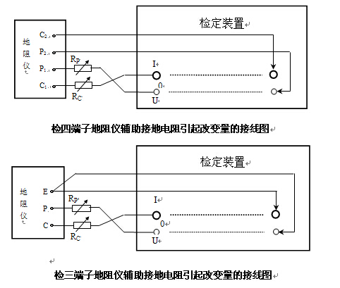 由于不同型號的接地導(dǎo)通電阻測試儀(工頻接地電阻測試儀)輸出的測試電流不同,測試范圍也可能不一樣,因而檢定裝置的電阻值和最大工作電流也應(yīng)與之匹配。在檢定基本誤差時(shí),將被檢測試儀置于適當(dāng)?shù)牧砍,用截面積足夠大的連接線將本檢定裝置與被檢測試儀正確連接,如下圖所示: