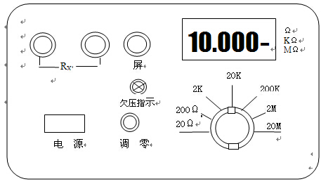 用于顯示測量結(jié)果,液晶顯示器字高18mm,自左至右依次顯示極性(調(diào)零用、負(fù)顯負(fù)號(hào),正時(shí)不顯)。4 1/2位數(shù)字,量綱(Ω、KΩ、MΩ)指示及小數(shù)點(diǎn),小數(shù)點(diǎn)及量綱指示受量程選擇開關(guān)控制。