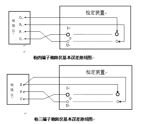 由于不同型號的接地導(dǎo)通電阻測試儀(工頻接地電阻測試儀)輸出的測試電流不同,測試范圍也可能不一樣,因而檢定裝置的電阻值和最大工作電流也應(yīng)與之匹配。在檢定基本誤差時(shí),將被檢測試儀置于適當(dāng)?shù)牧砍,用截面積足夠大的連接線將本檢定裝置與被檢測試儀正確連接,如下圖所示: