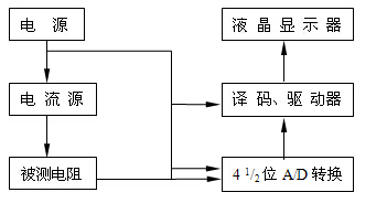 由高精度電流源產(chǎn)生一穩(wěn)定的電流流經(jīng)被測電阻,在被測電阻上產(chǎn)生的電壓經(jīng)處理后送至4 1/2位A/D轉(zhuǎn)換器轉(zhuǎn)換成相應(yīng)的數(shù)字量,該數(shù)字量再經(jīng)過譯碼器譯成七段碼,驅(qū)動(dòng)液晶顯示器,顯示相應(yīng)的電阻值。